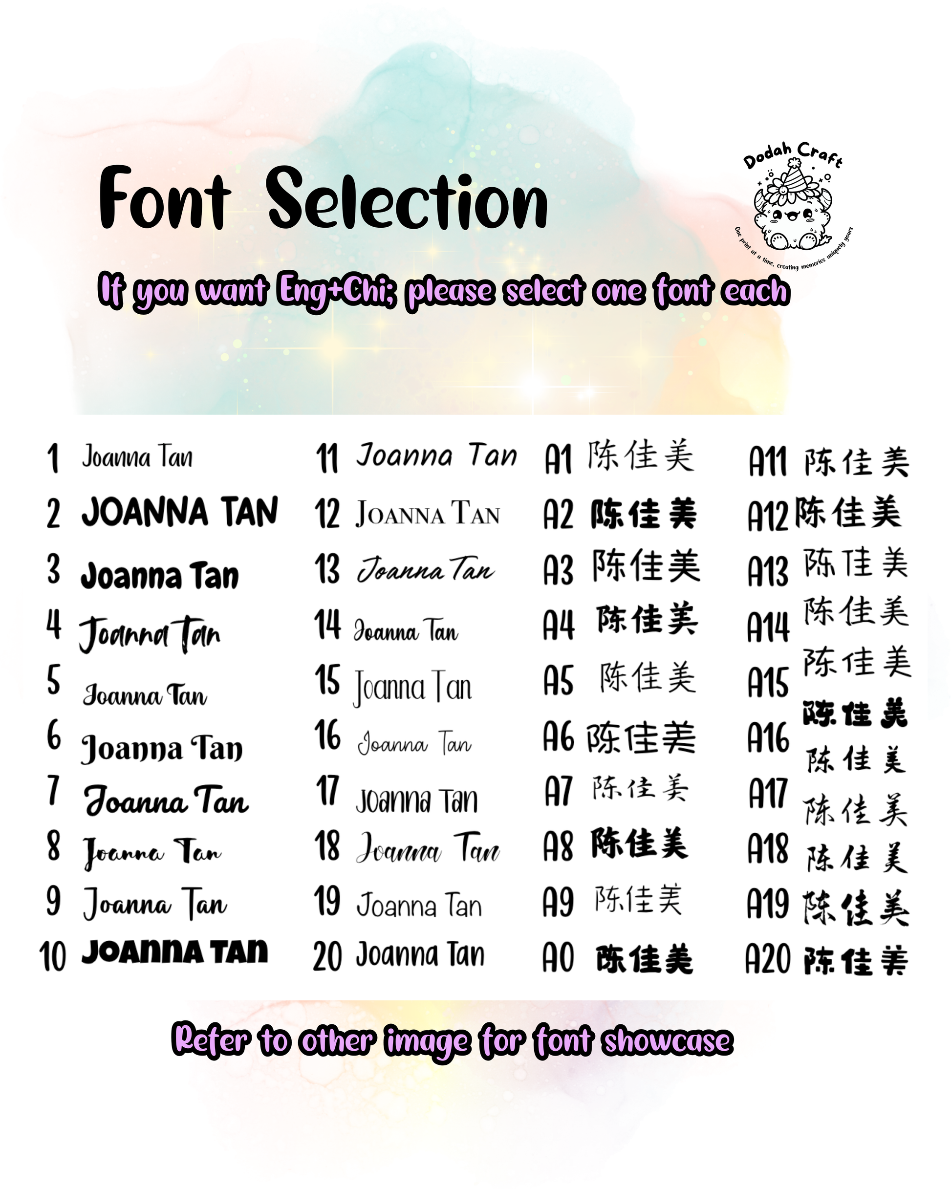 • Approx. 1.4cm height, width varies by name (max 10 English characters if combined with Chinese; up to 20 characters over 2 lines for English-only)